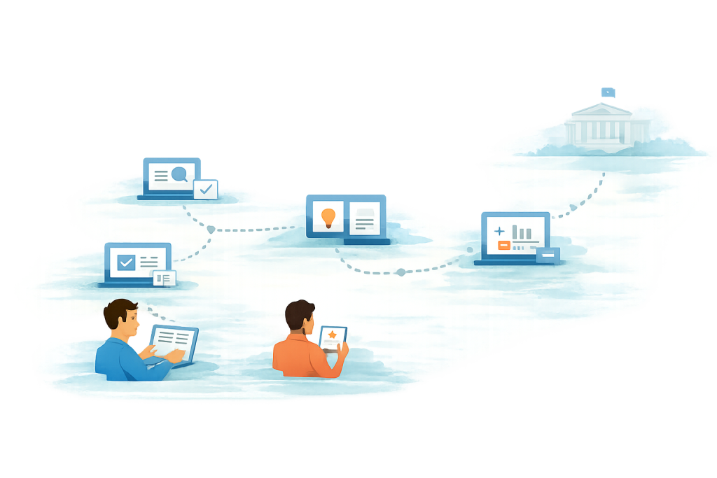 Participation initiatives are scattered across platforms, territories, and governance levels, making it difficult to connect contributions over time and across institutions. Citizen inputs often lack traceability. Once submitted, contributions rarely remain visible throughout the decision-making process, weakening trust and perceived impact. Civic tech platforms operate in silos, with limited interoperability and few shared standards, reducing collective learning and reuse of democratic data.